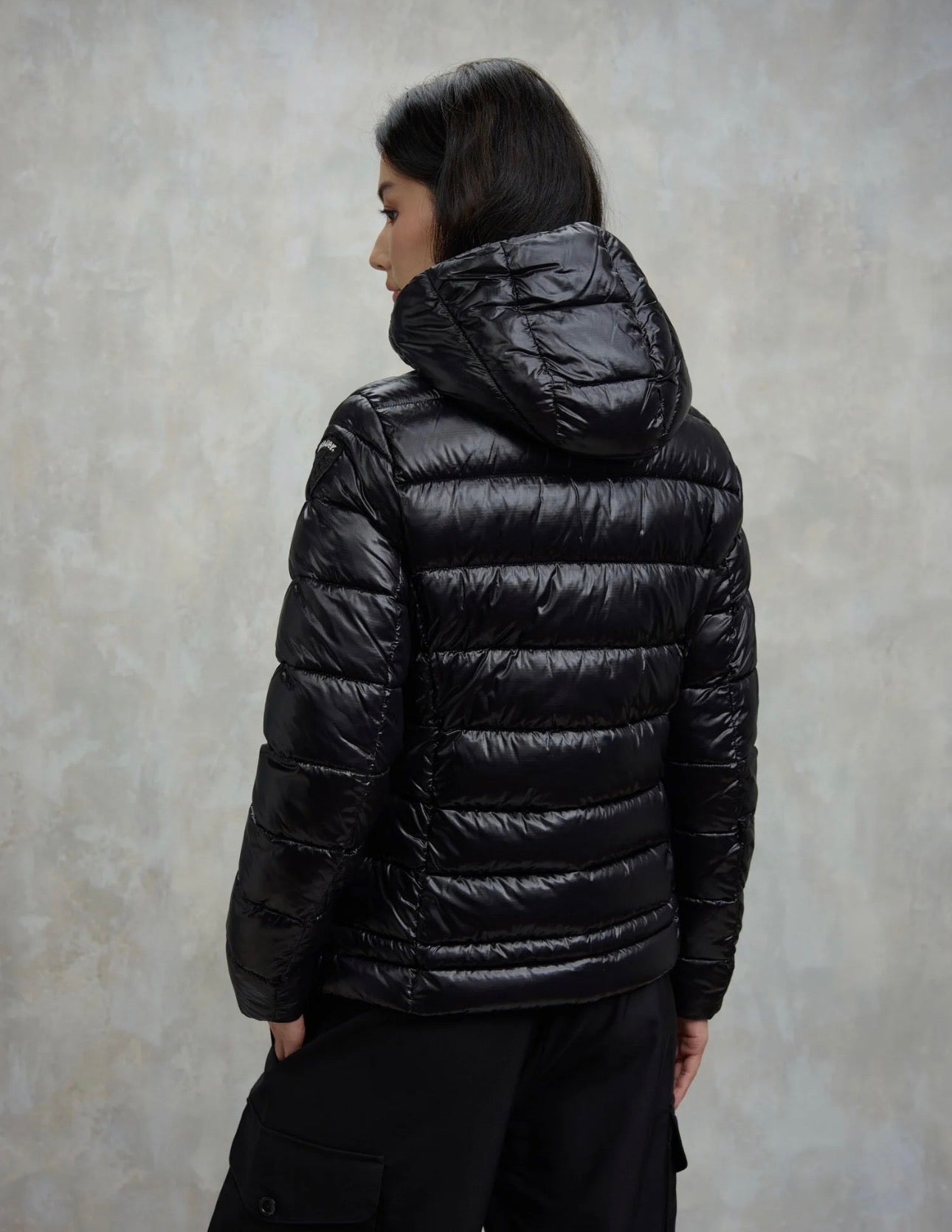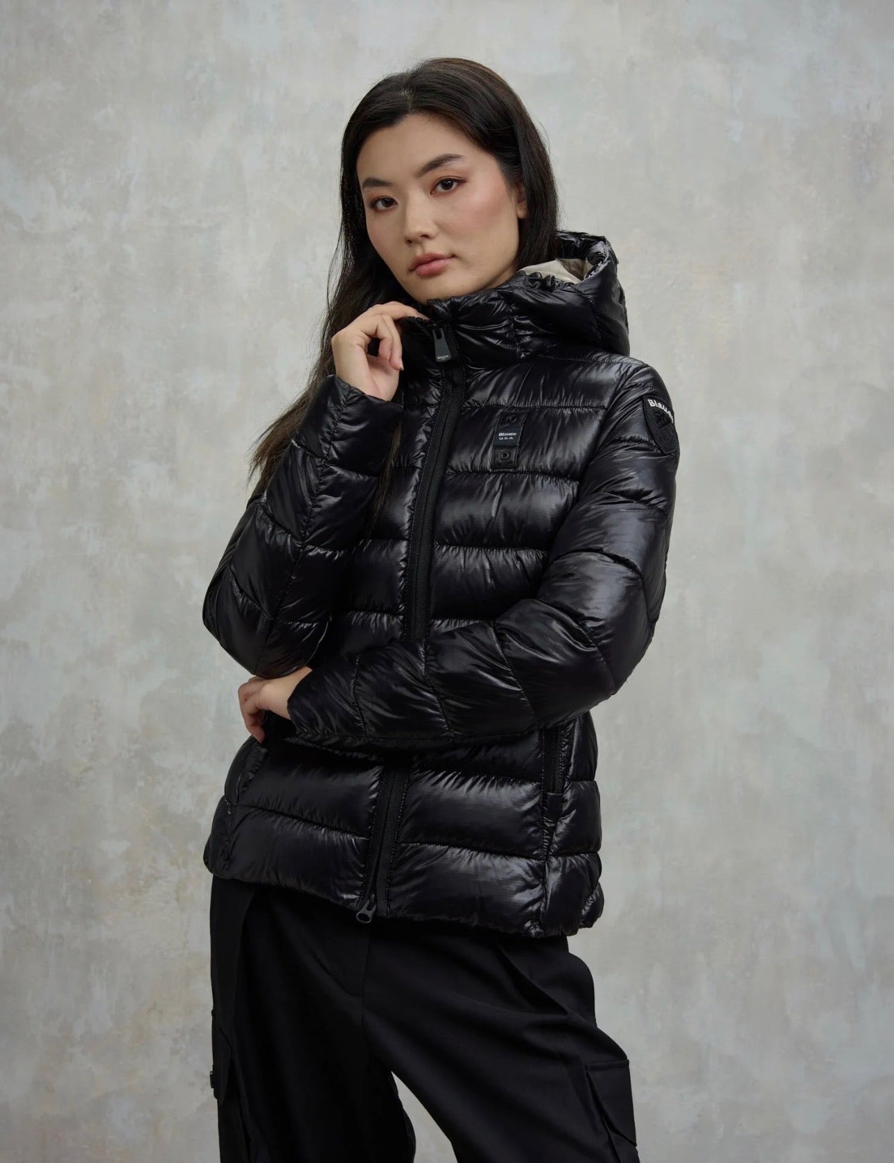 Giubbino donna blauer a righe Caroll invernale in nylon idrorepellente micro rip. Imbottitura sostenibile, effetto sfiancato dai colori moda. Cappuccio fisso con coulisse