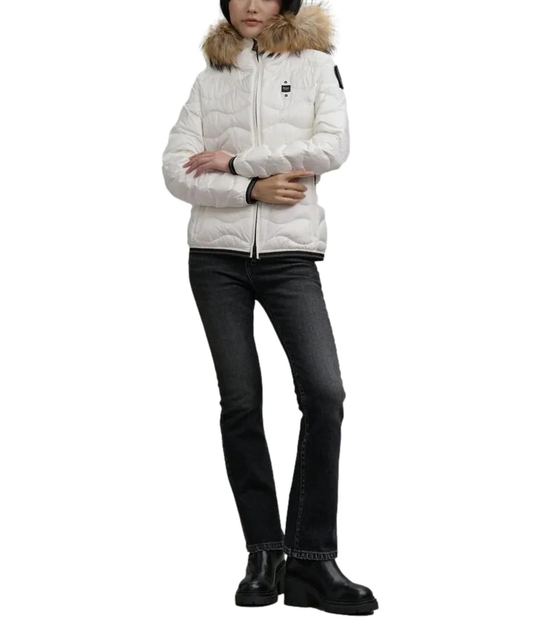 Blauer Piumino a Onde Aldie bianco, giubbino wave ondina da donna avvitato con cappuccio con pelliccia fur e logo strass removibile, giacca in piuma d'oca invernale