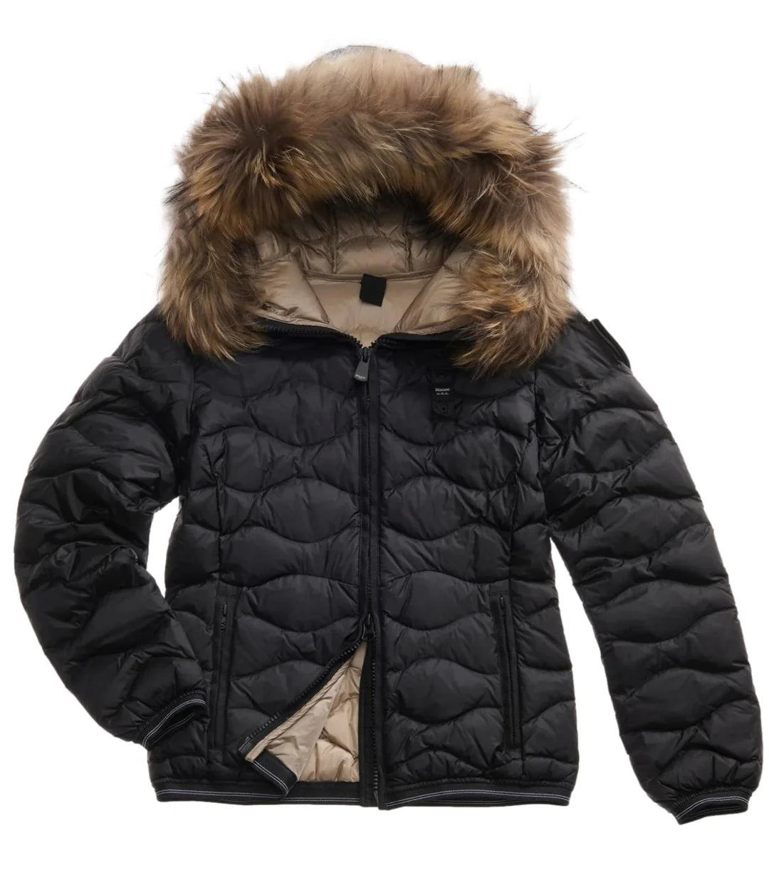 Piumino idrorepellente trapuntato ad onde orizzontali e con profilo del cappuccio in vera piuma. Capo iconico Blauer con imbottitura naturale, calda e non ingombrante, per essere sempre alla moda.