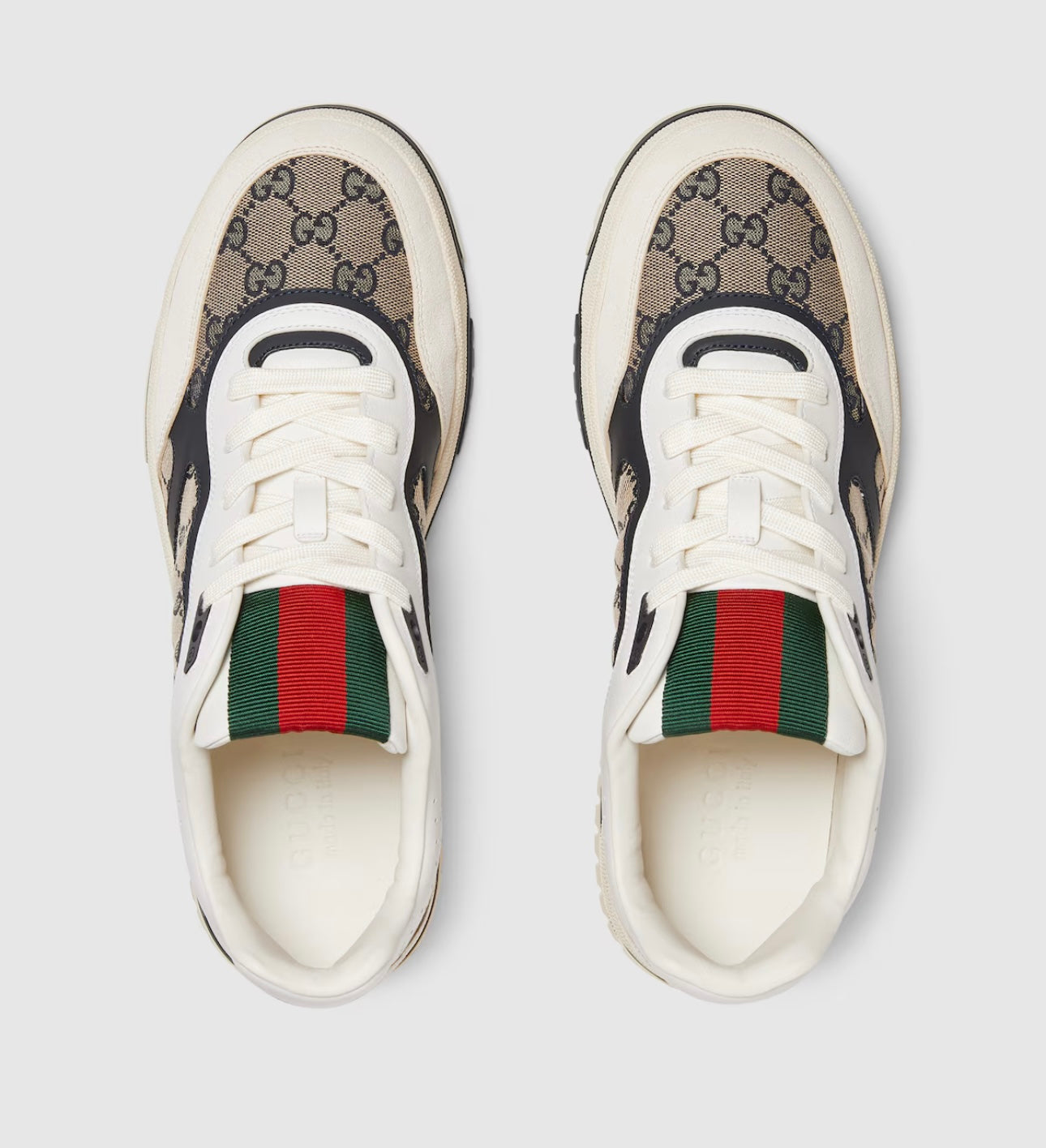 Le sneaker Re-Web presentano una silhouette contemporanea resa più vivace dalle storiche righe Gucci. Caratterizzate da dettagli iconici, queste sneaker sono realizzate in tessuto Original GG beige e blu e completate da un nastro Web verde e rosso sulla linguetta.