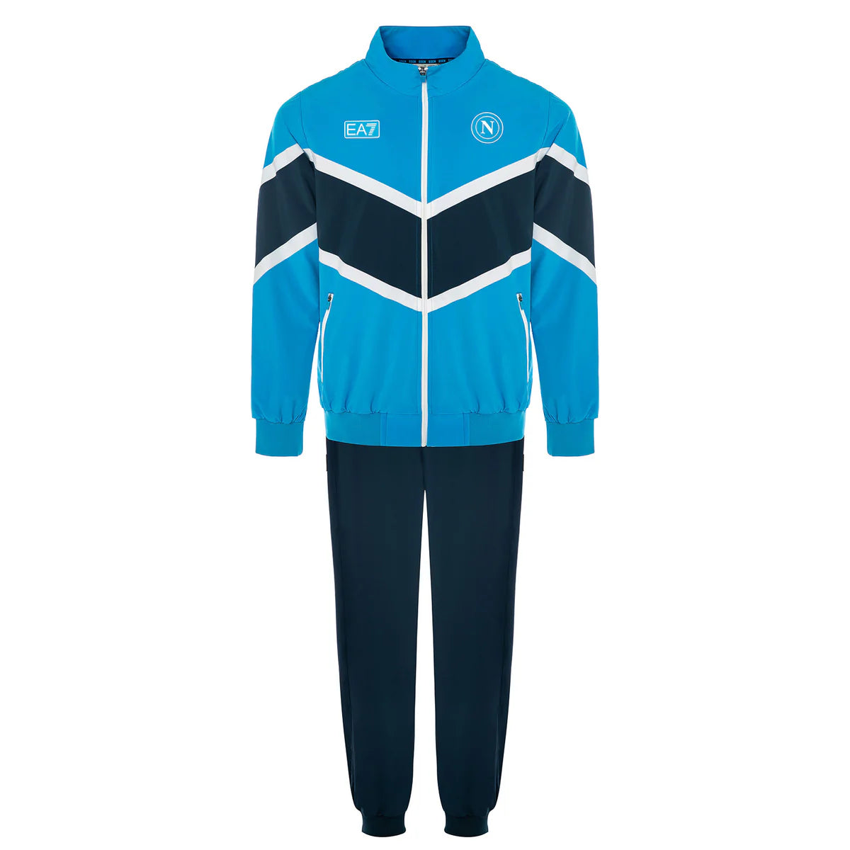 I pantaloni blu offrono una vestibilità comoda, garantendo libertà di movimento e comfort. I pantaloni hanno anche tasche con cerniera per una maggiore funzionalità. I loghi ufficiali SSC Napoli ed EA7, cuciti in bianco a contrasto con lo sfondo, aggiungono un tocco distintivo e di alta qualità sia alla giacca che ai pantaloni. Sul retro della giacca, spicca la scritta SSC Napoli stampata, completando il look con uno stile pulito e riconoscibile.
