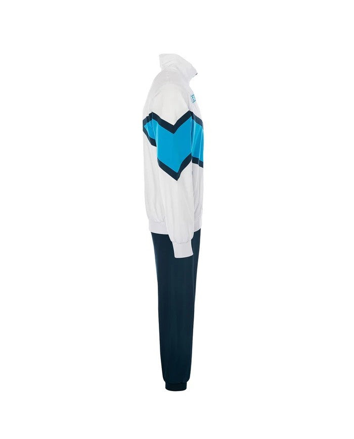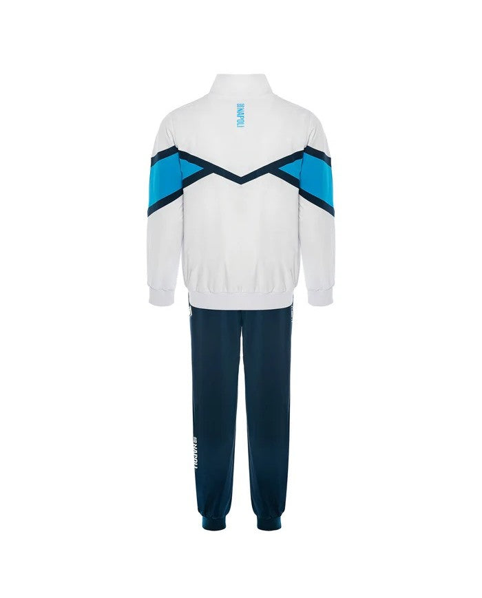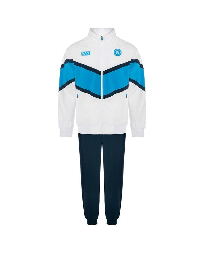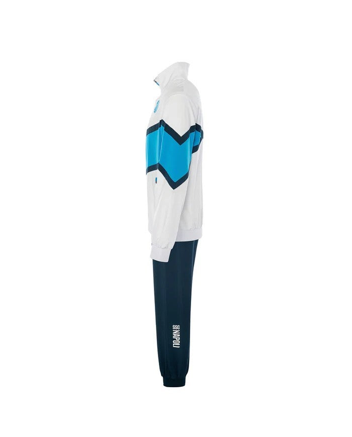 La tuta rappresentanza in polystretch della SSC Napoli è un capo sportivo elegante e funzionale, pensato per tifosi e atleti che vogliono esprimere con orgoglio la loro appartenenza alla squadra. La giacca si distingue per il suo design geometrico sviluppato in orizzontale, che alterna le tonalità di Bianco e Azzurro Napoli, creando un effetto visivo moderno, fresco e dinamico. La chiusura a zip completa consente di regolare facilmente l’apertura in base alle preferenze, mentre le pratiche tasche con zip offrono funzionalità e sicurezza. I pantaloni blu offrono una vestibilità comoda, assicurano libertà di movimento e sono perfetti per l’attività sportiva come per il tempo libero. Anche i pantaloni sono dotati di tasche con zip, pensate per garantire praticità in ogni situazione. I loghi ufficiali SSC Napoli e EA7, cuciti in azzurro a contrasto con il fondo, donano un tocco di qualità e raffinatezza sia alla giacca che ai pantaloni. Sul retro della giacca spicca il lettering SSC Napoli stampato, che completa il look con uno stile pulito e distintivo. Dettagli come le cuciture rinforzate rendono questa tuta resistente e durevole, ideale per accompagnare ogni giornata con comfort e spirito sportivo.