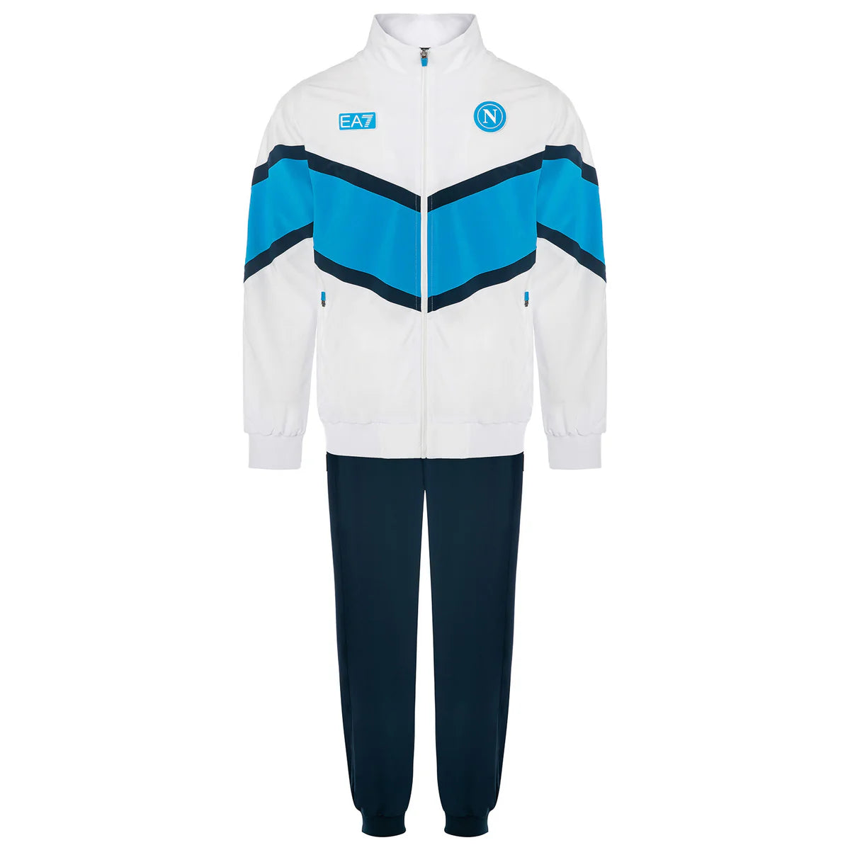 I pantaloni blu offrono una vestibilità comoda, assicurano libertà di movimento e sono perfetti per l’attività sportiva come per il tempo libero. Anche i pantaloni sono dotati di tasche con zip, pensate per garantire praticità in ogni situazione. I loghi ufficiali SSC Napoli e EA7, cuciti in azzurro a contrasto con il fondo, donano un tocco di qualità e raffinatezza sia alla giacca che ai pantaloni. Sul retro della giacca spicca il lettering SSC Napoli stampato, che completa il look con uno stile pulito e distintivo.
