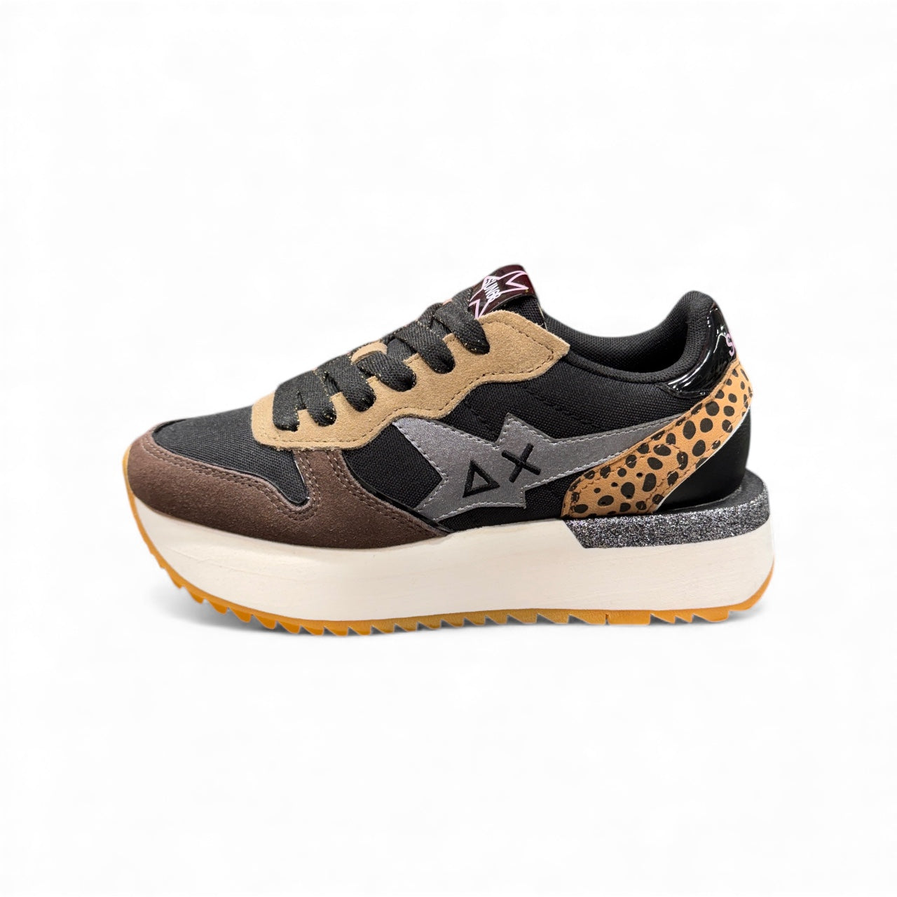 Scarpa con doppio rialzo repellente nera-marrone-leopardata